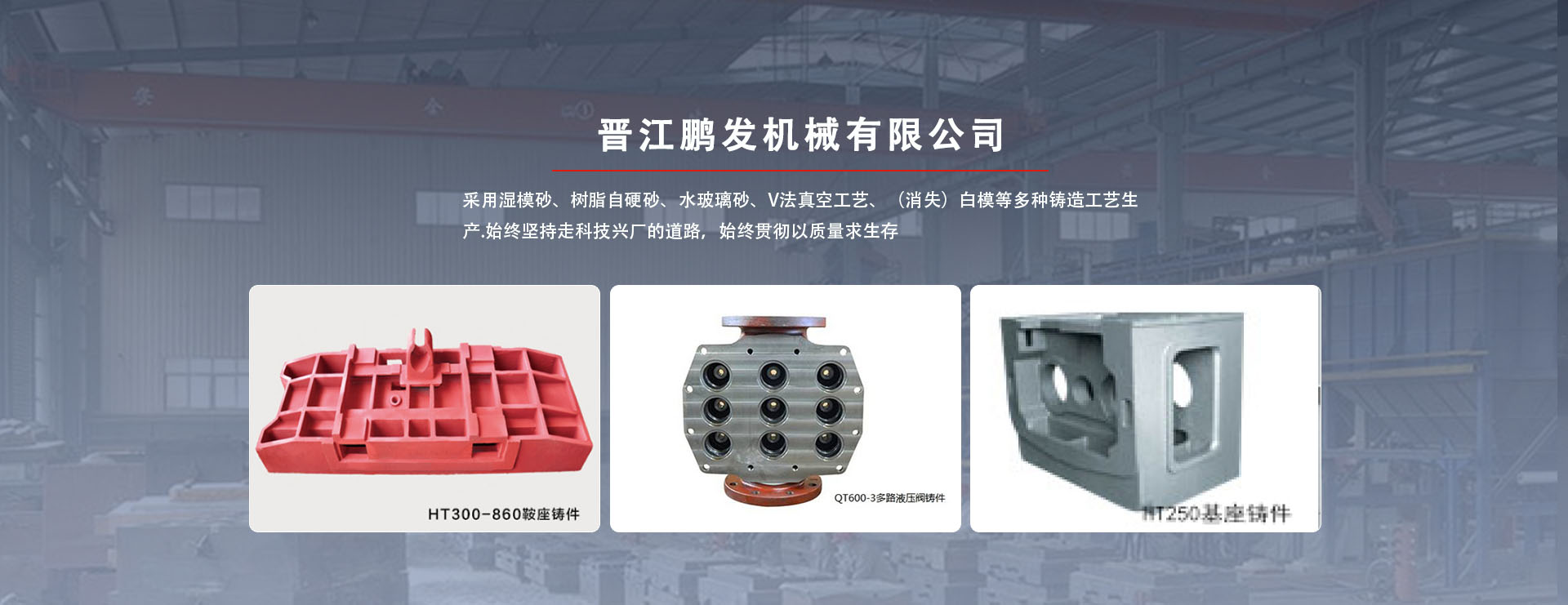 鵬發(fā)機械鑄造生產(chǎn)鞋機、大圓針織機、液壓機、數(shù)控機床、CNC加工中心配件。鵬發(fā)機械鑄造采用濕模砂、樹脂自硬砂、水玻璃砂、V法真空工藝、(消失)白模等多種鑄造工藝生產(chǎn)。鑄件材質(zhì)有:多種牌號灰口鑄鐵、多種牌號球墨鑄鐵、鑄鋼件,同時也生產(chǎn)低合金鋼、高錳鋼等材質(zhì)鑄件。員工120人,其中技術(shù)人員12人。具有雄厚的技術(shù)力量、先進的檢測儀器及完善的管理體系。現(xiàn)有設(shè)備:2T中頻感應(yīng)電爐3套6爐,雙臂樹脂自硬混砂機3套,S114混砂機3套,V法真空鑄造生產(chǎn)線造型工作臺6站,拋丸、水力清理鑄件5套,退火設(shè)備1條,爐前鐵液質(zhì)量管理儀,高頻紅外碳硫分析儀,微機高速分析儀,熔煉測溫儀,布氏、洛氏硬度計,金相、拉力試驗機,光譜儀等生產(chǎn)、檢測設(shè)備齊全。